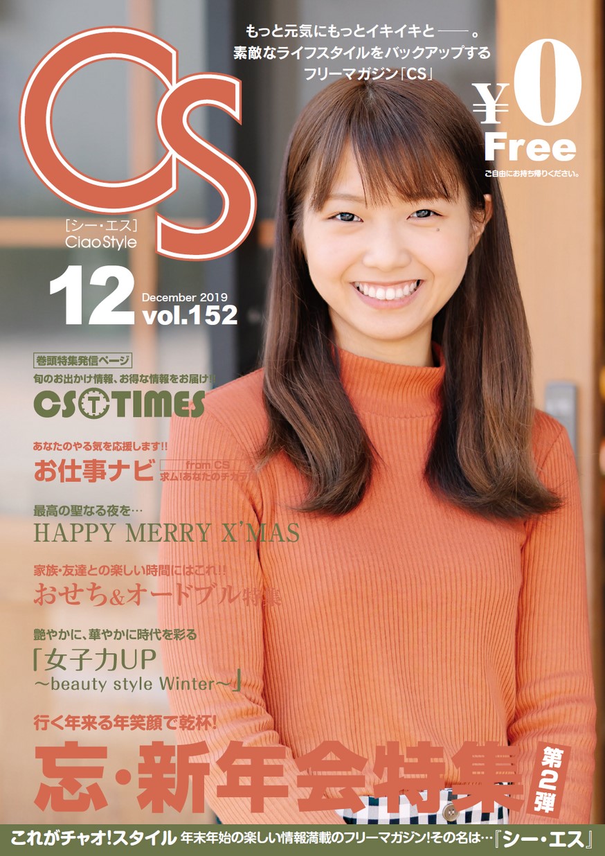 CS152号2019年11月25日発行 CONTENTS・行く年来る年笑顔で乾杯!忘・新年会特集第2弾 ・最高の聖なる夜を…HAPPY MERRY X'MAS ・艶やかに、華やかに時代を彩る「女子力UP〜beauty style Winter〜」