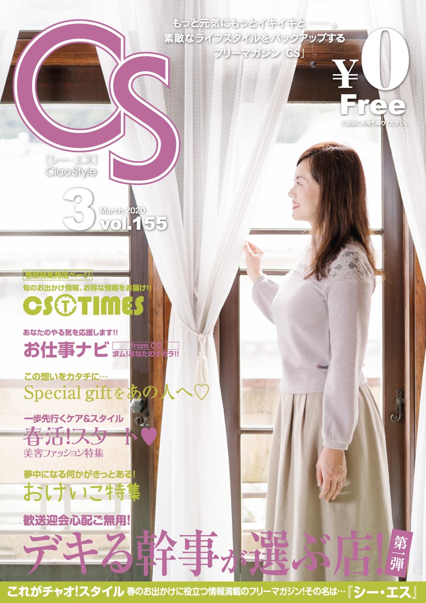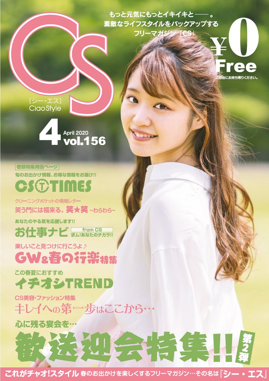 CS156号2020年3月25日発行 CONTENTS・心に残る宴会を…歓送迎会特集!!第2弾 ・楽しいこと見つけに行こうよ♪GW&春の行楽特集 ・この春夏におすすめ イチオシTREND ・CS美容・ファッション特集 キレイへの第一歩はここから…